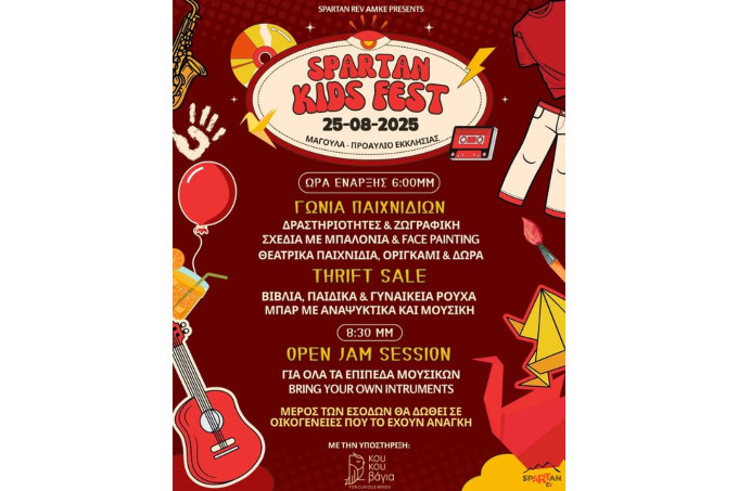 Spartan Kids Fest: Μια Γιορτή Δημιουργίας και Χαράς δίπλα στο ποτάμι! Η Spartan Rev ΑΜΚΕ, σε συνεργασία με το βιβλιοπωλείο «Κουκουβάγια», σας προσκαλούν σε μια μαγική καλοκαιρινή βραδιά για μικρούς και μεγάλους, στο ειδυλλιακό τοπίο της Μαγούλας Σπάρτης, δίπλα στο ποτάμι.