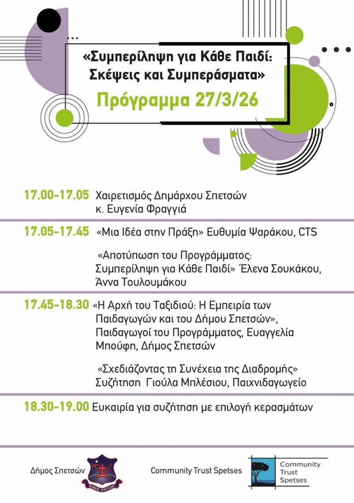 Την Παρασκευή 27 Μαρτίου 2026 στην Αναργύρειο και Κοργιαλένειο Σχολή του Δήμου Σπετσών πραγματοποιείται η εκδήλωση- παρουσίαση για τα συμπεράσματα από το πρόγραμμα «Συμπερίληψη για Κάθε Παιδί» που υλοποιήθηκε στον Παιδικό Σταθμό του Δήμου Σπετσών.