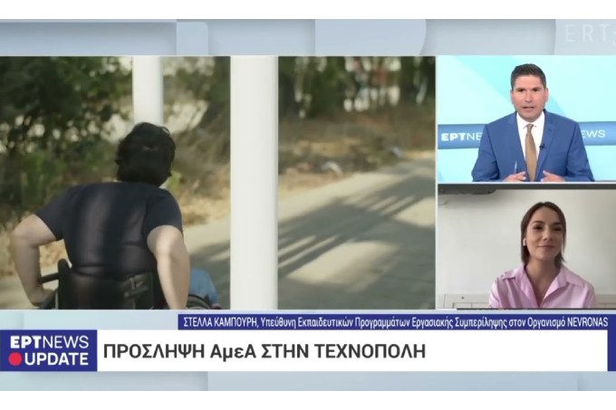 Στην εκπομπή «Update» της ΕΡΤ NEWS φιλοξενήθηκε συζήτηση αφιερωμένη στην Εργασιακή Συμπερίληψη, με αφορμή την πρόσληψη του Αλεξάνδρου και της Βασιλικής, δύο εργαζομένων με αναπηρία στο Café της Τεχνόπολης Δήμου Αθηναίων. Στην εκπομπή συμμετείχε η Στέλλα Καμπούρη, Υπεύθυνη Εκπαιδευτικών Προγραμμάτων Εργασιακής Συμπερίληψης του Nevronas.