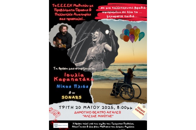 Την Τρίτη 20 Μαΐου 2025 , στις 20:00 , το Ε.Ε.Ε.ΕΚ Μαθητών με Προβλήματα Όρασης & Πολλαπλές Αναπηρίες διοργανώνει στο Δημοτικό Θέατρο «Αλέξης Μινωτής» στο Αιγάλεω, μια μεγάλη συμπεριληπτική συναυλία με τη συμμετοχή μεικτών μουσικών συνόλων μαθητών/τριών με και χωρίς αναπηρία, από τις σχολικές μονάδες του Δήμου Αιγάλεω.