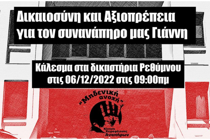 Η Κίνηση Χειραφέτησης Αναπήρων: “Μηδενική Ανοχή” καλεί σε συγκέντρωση συνυπευθυνότητας στα δικαστήρια Ρέθυμνου στις 06/12/2022 09:00πμ όπου θα διεξαχθεί η δίκη 4 κατηγορουμένων για βιασμό ατόμου με νοητική αναπηρία. Οι δύο από τους κατηγορούμενους είναι ιερείς.
