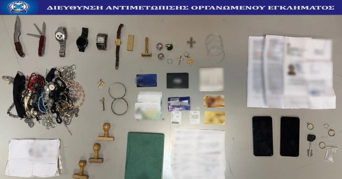 Σύλληψη αλλοδαπής για διακεκριμένες κλοπές κυρίως σε βάρος ατόμων με κινητική ή νοητική αναπηρία, προσποιούμενη την οικιακή βοηθό. Σε έρευνες, μεταξύ άλλων, βρέθηκαν και κατασχέθηκαν ρολόγια, δαχτυλίδια, κοσμήματα, αναδιπλούμενος σουγιάς, μικροποσότητα ναρκωτικών ουσιών και πλαστή βεβαίωση νόμιμης διαμονής