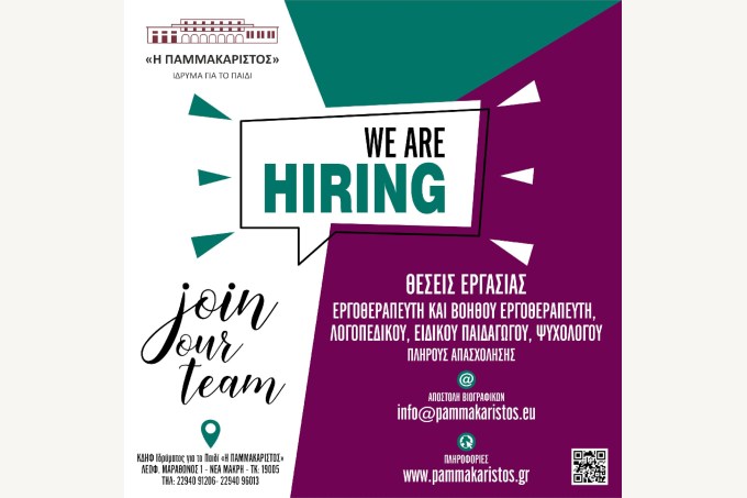 Το Ίδρυμα για το Παιδί «Η ΠΑΜΜΑΚΑΡΙΣΤΟΣ» καλεί υποψήφιους να εκδηλώσουν ενδιαφέρον για την στελέχωση των τμημάτων  του Κέντρου Διημέρευσης Ημερήσιας Φροντίδας, ειδικότητας Εργοθεραπευτή ή Βοηθού Εργοθεραπευτή, Λογοπεδικού, Ειδικού παιδαγωγού, Ψυχολόγου, με σύμβαση εξαρτημένης εργασίας ορισμένου χρόνου πλήρους απασχόλησης (με προοπτική ανανέωσης).