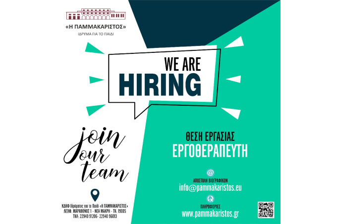 Το Ίδρυμα για το Παιδί «Η ΠΑΜΜΑΚΑΡΙΣΤΟΣ» καλεί υποψήφιους να εκδηλώσουν ενδιαφέρον για την κάλυψη θέσης Εργοθεραπευτή, για την στελέχωση τμημάτων του ΚΔΗΦ, πλήρους απασχόλησης με σύμβαση εξαρτημένης εργασίας ορισμένου χρόνου με προοπτική ανανέωσης.