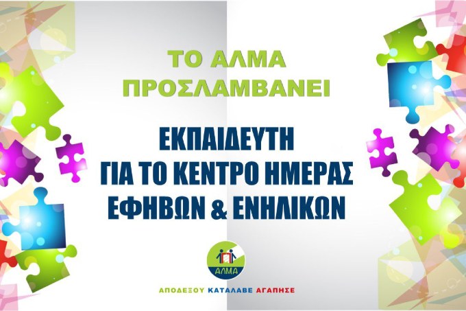 Θέση Εργασίας: ΠΕ Κοινωνιολόγος, ΠΕ Ψυχολόγος ή ΠΕ Ειδ. Παιδαγωγός για μερική απασχόληση(25 ώρες) ορισμένου χρόνου στο Κέντρο Ημέρας για εφήβους και ενήλικες με ΔΑΦ και Νοητική Αναπηρία, με ωράριο 12:00-17:00 από Δευτέρα έως Παρασκευή