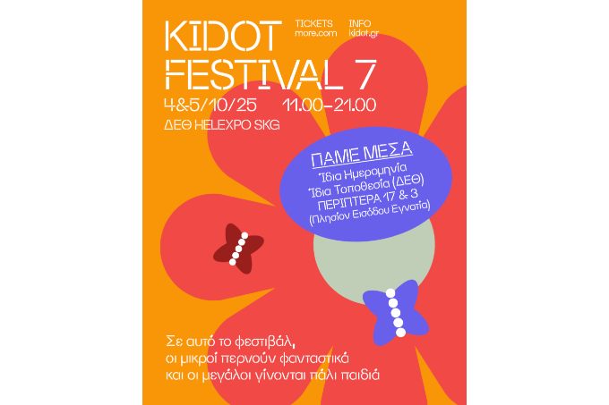Τo KIDOT Festival 7 αγκαλιάζει κάθε αλλαγή με ενθουσιασμό και χαμόγελο.Το αγαπημένο family festival της πόλης προσαρμόζεται με χαμόγελο και με αίσθηση ευθύνης στις καιρικές συνθήκες και σας υποδέχεται φέτος στον εσωτερικό χώρο της ΔΕΘ, στα Περίπτερα 17 & 3 (Πλησίον Εισόδου Εγνατία).