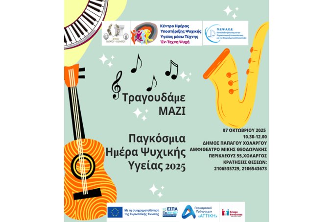 Με αφορμή την Παγκόσμια Ημέρα Ψυχικής Υγείας, το Κέντρο Ημέρας «Έν-Τεχνη Ψυχή», σε συνεργασία με τον Δήμο Παπάγου – Χολαργού, σας προσκαλεί σε μια ξεχωριστή εκδήλωση αφιερωμένη στη δύναμη της μουσικής, της τέχνης, του αποστιγματισμού και της συμπερίληψης.