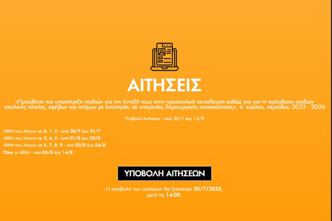 Άρχισε σήμερα Τετάρτη 30 Ιουλίου 2025 και ολοκληρώνεται την 14η Αυγούστου, η ηλεκτρονική υποβολή των αιτήσεων για τη συμμετοχή των ενδιαφερόμενων για το πρόγραμμα «Προώθηση και υποστήριξη παιδιών για την ένταξή τους στην προσχολική εκπαίδευση καθώς και για τη πρόσβαση παιδιών σχολικής ηλικίας, εφήβων και ατόμων με αναπηρία, σε υπηρεσίες δημιουργικής απασχόλησης» α΄ κύκλου, περιόδου 2025 – 2026. Διάρκεια υποβολής 30/7/2025 – 14/8/2025. για ΚΔΑΠ ΜΕΑ, παιδικούς σταθμούς και ΚΔΑΠ.